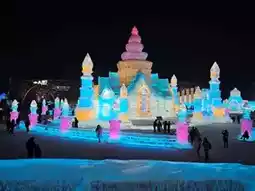 Back in Harbin, we dedicated our second day to the world-famous Harbin Ice and Snow World. We arrived just before sunset, as the massive ice sculptures began to light up in dazzling colors. It was absolutely surreal — an entire city of crystal-like structures made from blocks of the Songhua River, including full-sized castles, pagodas, bridges, and even ice slides.