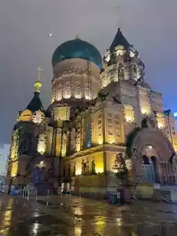 The Byzantine dome of Saint Sophia Cathedral looks even more solemn under the snow. The intricate reliefs and golden crosses, already rich with Russian flair, are dusted with snowflakes that fall softly on the green copper dome, like a sprinkle of sugar frosting on this century-old building. Once a military church for the Russian army, it is now a landmark of Harbin. On snowy days, newlyweds often take wedding photos in front of the cathedral, where the pure white wedding dresses blend with the snowy scenery and vintage architecture, as if transported to a small town in Eastern Europe.