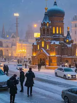 • Wide shot from the square: Capture the cathedral surrounded by falling snow — it feels like a movie still. 🎥
