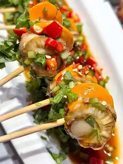 Tender scallops coated in a rich sweet-ma numbing sauce — first comes the sweetness, then the tingle of spice that lingers just right. Each bite is a mini flavor explosion!