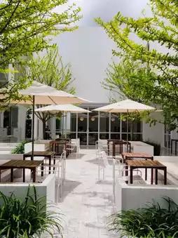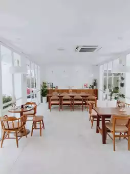 Atmosphere: A minimalistic cafe that stands out with its white and brown decor. The cafe offers plenty of seating options both indoors and outdoors, with a beautifully arranged garden and lush green plants that create a refreshing ambiance. They serve both drinks and food.