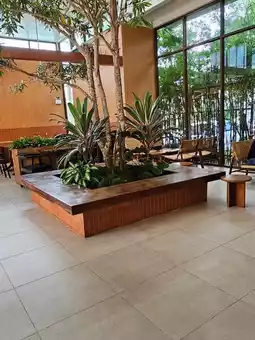 The atmosphere inside the shop is decorated in wooden tones.