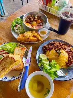 🥛 Humble Farm Kitchen is a restaurant and cafe with a warm and friendly atmosphere, like sitting in a garden house. There are both indoor and outdoor seating areas, decorated with trees and wooden furniture, giving a shady and relaxing feeling. Suitable for those who want to escape the hustle and bustle to relax amidst nature. The shop focuses on serving healthy food and drinks, using fresh ingredients from the farm. There are many menus to choose from, including Thai food, Western food, and homemade bakery.