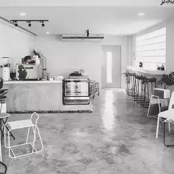 • The shop is decorated in a cool minimalist style with exposed concrete + wood, with a warm and calm mood.