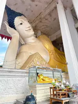 - Enshrining Phra Phuttha Mahatmangkhon (large reclining Buddha) approximately 35 meters long, 15 meters high, and 10 meters wide, it is considered the 3rd largest reclining Buddha image in the world.