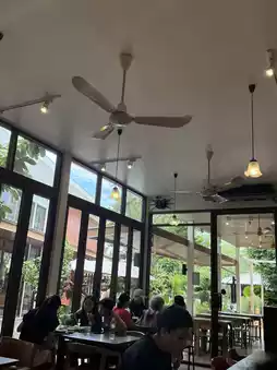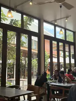 The restaurant's atmosphere is open and airy, with a green corner for relaxing. 🍃