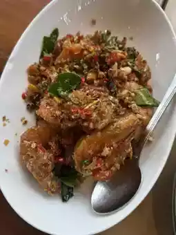 🍤 Salt and Pepper Shrimp – Large, crispy fried shrimp tossed with fried garlic and fresh chilies. Slightly salty and spicy, it's a delight to eat.
