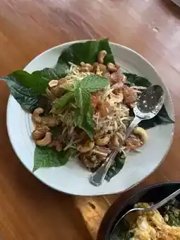 🥗 Roasted Mango and Coconut Salad – This dish is very refreshing, with a perfect balance of sour, sweet, and spicy flavors, with peanuts and cashew nuts adding a richness. Paired with betel leaves, it's a perfect match.
