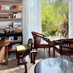 Amenity: The shop is decorated in a minimalist style, with tones of white and dark green, surrounded by a garden and large windows that let in natural light, perfect for relaxing or taking photos. 📸