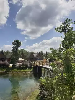 • A wooden bridge crosses the pond (or serves as a walking path), allowing visitors to stroll and take photos from various angles within the cafe and surrounding garden area.