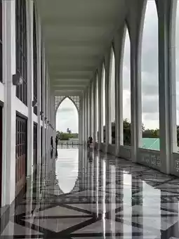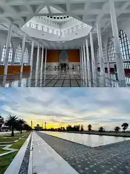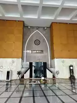 • The architecture is a blend of modern Islamic design, with tall round columns and a spacious hall.