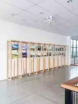 The steel frame and clear glass create a chic, modern photo spot, giving it the feel of a mini-skywalk.