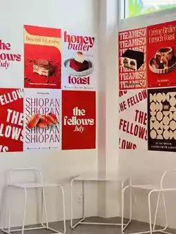 The interior is simple yet characterful, with walls adorned with the cafe's signature red posters, creating a sense of both coolness and warmth. This small space is packed with cute details.