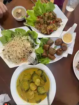 The food is delicious in a quiet location. For vegetarians, please inform them that there are no eggs or dairy products. The menu states that it's lacto-ovo. The restaurant will replace the eggs with soybean shells. I ordered the mixed vegetables with bitter melon and basil. The ginger in soy sauce was delicious and went well with the rice. They also have a refreshing soda.