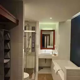 This is my first time checking into the Garden View Deluxe King room at Monkham Village and found the room to be spacious and comfortable. Bathroom is spacious with bathtub and good water pressure on the standing shower. Amenities are provided and if you forgot anything, you can request. Bed is comfortable and loved the 4 pillows provided.