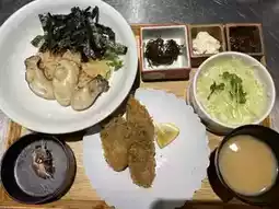 Kakiya Set Meal: JPY 2,600 (includes side dishes and soup, all featuring oysters). The set meal includes two grilled oysters, and in total, you'll enjoy about 11 oysters. The oysters are fresh, sweet, and absolutely delicious.