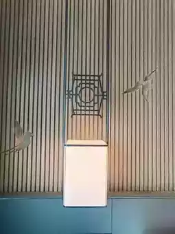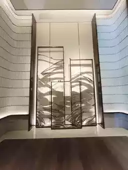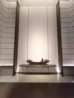 The entrance begins with a black-framed white screen wall, and the mirrored pool and copper wall echo the Moon Pond Lake in Anhui Hongcun. Together with the cascading water features and camphor forest, it isolates the city's hustle and bustle and creates the artistic conception of "after walking dozens of steps, the view suddenly opens up." The full text of "Peach Blossom Spring" is presented with a projection waterfall, and details such as copper murals and mortise and tenon wooden boats reproduce the Huizhou landscape and life scenes. The guest room corridors are marked by glass bookcases.