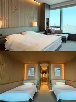 The hotel features a modern and grand design, with the high-ceiling lobby making a striking first impression. Guest rooms are decorated in warm tones, creating a cozy and comfortable atmosphere. Floor-to-ceiling windows offer panoramic city views, especially enchanting during the nighttime light shows.