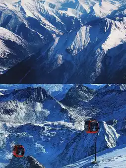 - Right side of cableway cabin: overlook U-shaped glacial valley + colorful forest, telephoto 70-200 mm.