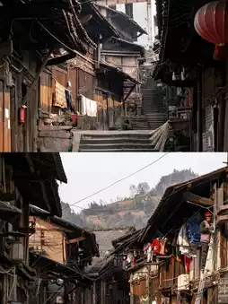 The town follows the natural contours of the mountains, embraced by peaks and waters. Its distinctive features include wooden through-type frames, hanging mountain-style roofs, small grey tiles, and cobblestone streets. Along the riverside, you'll find traditional stilt houses and corridor buildings. While some of the town's original "three palaces and eight temples" still stand today, most are not open to the public and remain in a state of abandonment, adding to the town's rustic and mysterious atmosphere.