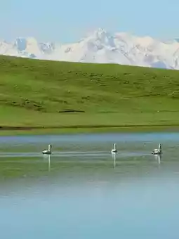 Bayanbulak is home to 128 bird species. In April, swans fly over the Himalayas from India, their wings casting reflections on the lakes against the snowy peaks. At twilight, the swans curve their necks into heart shapes💖, while herds of cattle and sheep graze peacefully in the distance—pure romance.