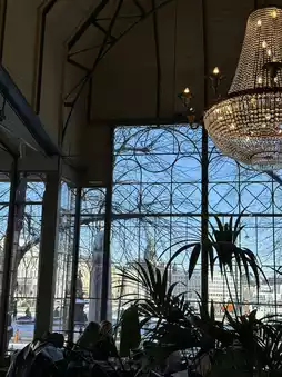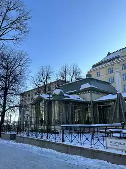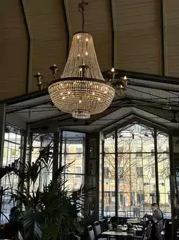 Walking into Helsinki's Torikorttelit district feels like stumbling into a glass palace straight out of a Nordic fairytale. This cafe's understated exterior conceals a breathtaking interior featuring crystal chandeliers, warm wood accents, and a sun-drenched glass ceiling.