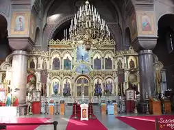 - Interior: Decorative frescoes, golden iconostasis, and candlelight create an Orthodox atmosphere.