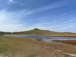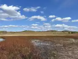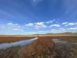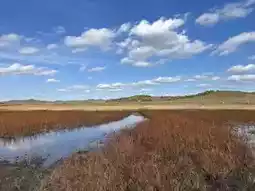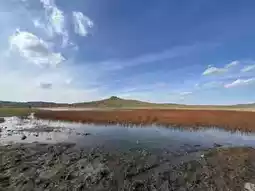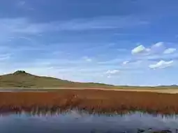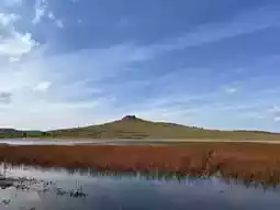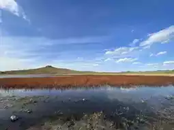 The scenery of Wild Duck Lake is also quite beautiful. The lake surface is wide and calm, like a mirror of the sky, reflecting the distant Xiaogushan. From this angle, the shape of Xiaogushan is very picturesque, serving as the perfect backdrop for the lake. Near the lakeshore grow hydrophilic plants with reddish hues, forming a red carpet. Although it cannot compare in grandeur to the famous Liaohekou red carpet, its elegance is equally impressive. The red carpet of just the right width adds a bright splash of color among the yellow-green grassland, blue sky, and azure lake, making the scene even more perfect.