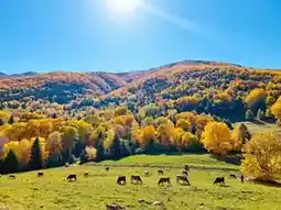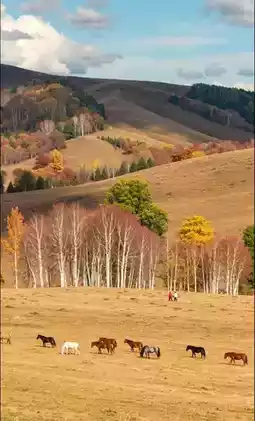 This is a fairy tale world in autumn, where the birch forest turns into a golden sea, and the grassland wears a fiery red coat, as if God spilled a palette of colors🎨