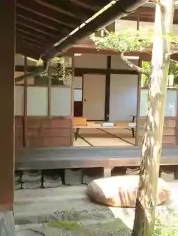 The grounds are surrounded by trees, and the sunlight passes through softly, creating a cool, comfortable, and mysterious space.
