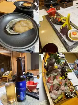 I went to Hamanoyu, a restaurant in Inatori, East Izu. I used to go to this inn every year when I was a child. I felt nostalgic and went back for the first time in a long time! I used to stay in a large room, but this time I stayed in a premium compact room with a deck. From the deck, you can enjoy the ocean🌊 that spreads out in front of you! Before dinner, I enjoyed the bath, went to the shop next to the lobby, and took a lot of photos from the deck. Since it is an inn where you can eat, the dinner was amazing🐟・Steamed abalone in sake・Appetizer・MOON ROAD (I ordered craft beer separately)・Boat-shaped platter・Softly boiled Japanese beef・Simmered golden-eyed snapper・Rice cooked in a pot of sea bream・Dessert