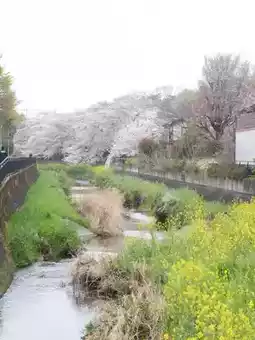 If you walk along the Kurome River from Higashikurume Station on the Seibu Ikebukuro Line, you will find "Cherry Blossom Park" with large cherry trees.