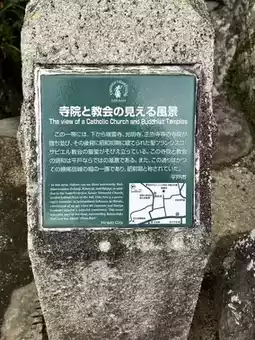 If you go up the stone-paved slope, you can see the green spire and cross of the Xavier Memorial Church, and below that you can see the tiled roofs of Shoshu-ji Temple, Komyo-ji Temple, and Zuiun-ji Temple