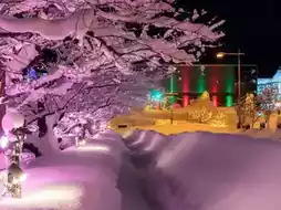 The illumination is at its most breathtaking when the ground is blanketed with snow. Soft pink lights, designed to evoke the image of cherry blossoms, reflect off the pristine white snow, creating the enchanting illusion of "winter sakura." 🎶