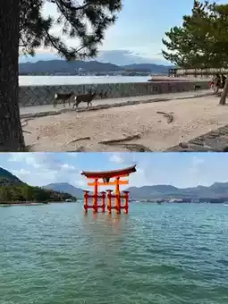 2. Miyajima: Located on the Seto Inland Sea, it is famous for its large torii gate and is one of the "Three Views of Japan". You can take the tram to Miyajimaguchi Station, then walk to the pier and take the shuttle bus and cable car to the top of the mountain to overlook the Seto Inland Sea.
