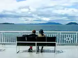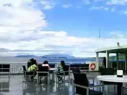 When the ferry approaches its destination, head to the third floor. The view is much more open compared to indoors. There are outdoor tables on the third floor, so you can enjoy a light snack and drink while taking in the scenery.