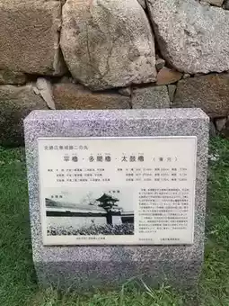 The original main tower has been restored and is now used as a history museum, Hiroshima Castle. Apart from the remains of the Honmaru and Ninomaru baileys, urban development has left no trace of the castle ruins, and the only remains that can be confirmed outside the historic site are the top stone of the moat's stone wall, the remains of the earthen ramparts of the central moat on the grounds of Hiroshima High Court, and the remains of the outer tower on the south side of the east end of Karasaya Bridge.