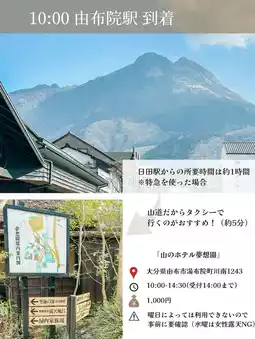 10:00 Arrive at Yufuin Station (Hita Station▷Yufuin Station, 60 minutes by express train)