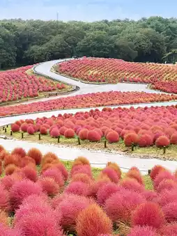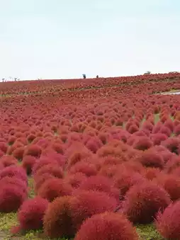 Hitachi Seaside Park, located in Hitachinaka City, Ibaraki Prefecture, is famous for its spring nemophila flowers. But in autumn, it's the season for "Kochia"! These round, bushy plants transition from green to red, creating a charming gradient.