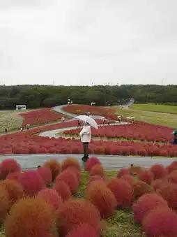 In addition to kochia, cosmos flowers also bloom during this period. The expansive park is filled with seasonal flowers, allowing visitors to enjoy a leisurely day. It's an ideal destination for a picnic or a stroll in the pleasant autumn breeze.