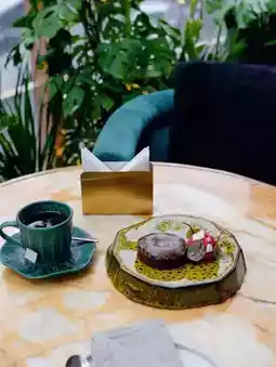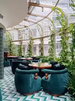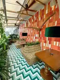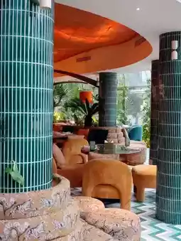 The interior of yunka is uniquely designed, reminiscent of a tropical jungle. Highlights are the plum lampshades, emerald