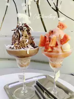 The day I went, I ordered 1 Chocolate Coconut Blend 70k its okey +1 Lychee Crush (lychee, rose, apricot) 80k (almost no apricot, rose, only watermelon and lychee) 6/10. The shop does not have cakes or salty foods.