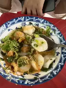 I’d heard of Bánh bèo before, but trying it here, in such a lively and authentic setting, was an entirely different experience. These little steamed rice cakes, served in tiny ceramic dishes, were beautifully topped with dried shrimp, scallion oil, and crispy pork skin. A small bowl of sweet and savory fish sauce came on the side, meant to be drizzled delicately over each bite.