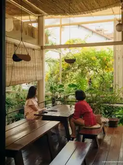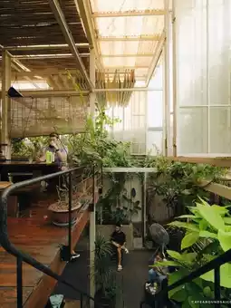 Aramour Coffee Roasters offers a serene garden setting adorned with lush greenery, creating a tranquil atmosphere. The café features both outdoor seating surrounded by plants and an upstairs air-conditioned room, providing a comfortable environment for guests. The space is designed to be spacious and airy, making it suitable for both relaxation and work.