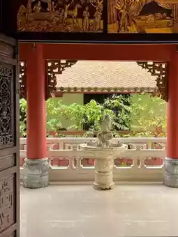Visitors are welcomed by a striking entrance decorated with detailed carvings and statues. Inside, you'll find beautiful Vietnamese-style structures, curved roofs, and elegant decorations. The garden filled with bonsai trees, lotus ponds, and shaded paths creates a perfect space for meditation and quiet reflection.
