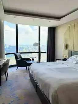 The floor-to-ceiling windows in the room offer great views overlooking the entire city~