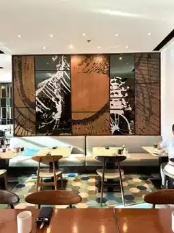 A spacious space with high ceilings. You can enjoy the morning view of the city from the window seats.
