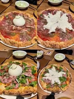 The highlight of this restaurant is undoubtedly their cheese pizzas! We ordered two flavors, with the standout being the Buffalo Cheese Pizza. The server ceremoniously cut open the round cheese, letting it ooze onto the pizza. This process added a sense of ritual and made the dining experience even more enjoyable.