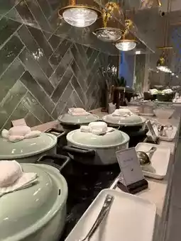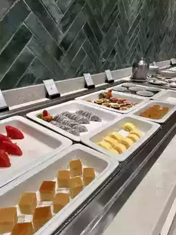 • Food & drinks: A full buffet with hot dishes, fresh fruit, coffee, tea, and even wine.