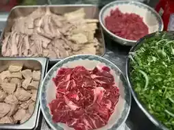 • A variety of beef cuts: raw flank, oxtail, ribs, beef balls, and more.